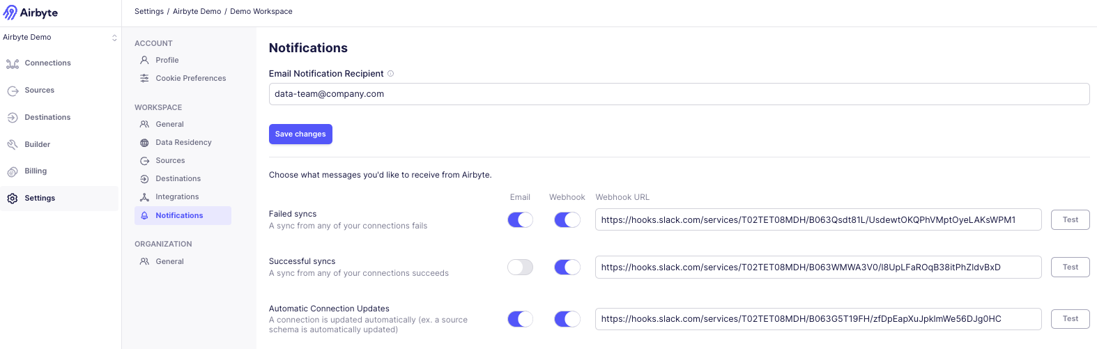 Toggle which messages you'd like to receive from Airbyte. All email notifications will be sent by default to the creator of the workspace.